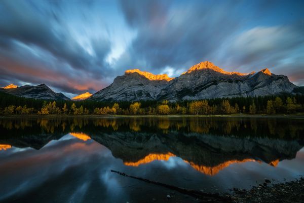 Hohe Berge neben dem See im Schatten der Wolken. Die Berggipfel sind von der Sonne orange gefärbt, was das Foto zu einem faszinierenden Erlebnis macht.