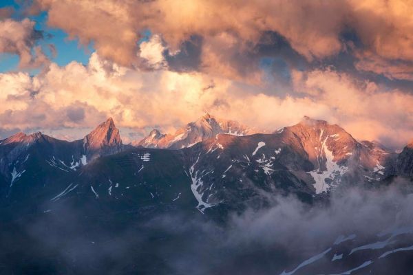 Scharfe Berggipfel baden im warmen Licht der untergehenden Sonne, während schwere Wolken darüber wirbeln. Schneereste und Nebel schaffen einen mystischen Kontrast zur kupferfarbenen Glut auf den Felsformationen.