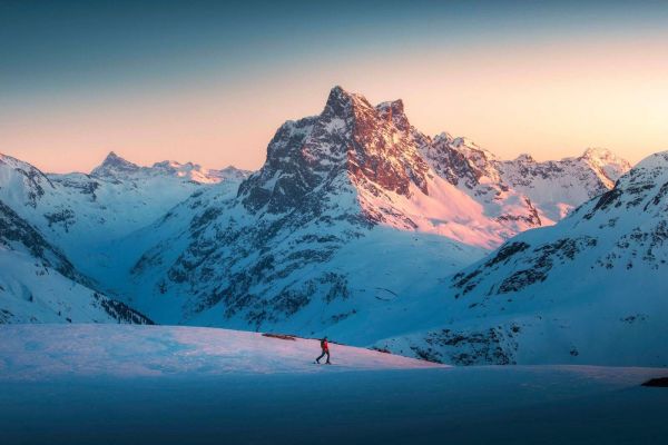 Ein imposantes Bergpanorama wird im warmen Licht der untergehenden Sonne gebadet. Eisige Schneefelder, steile Felsenspitzen und sanfte Pastellfarben schaffen zusammen ein ruhiges und kraftvolles Bild voller Tiefe und Gelassenheit.