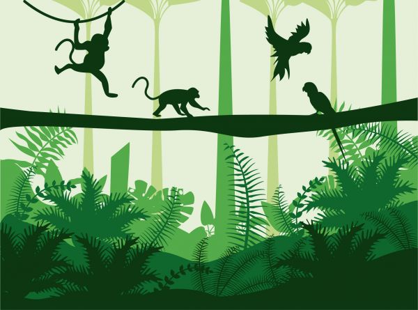 Eine grüne Illustration mit Affen, die in einem Affenkäfig spielen.
