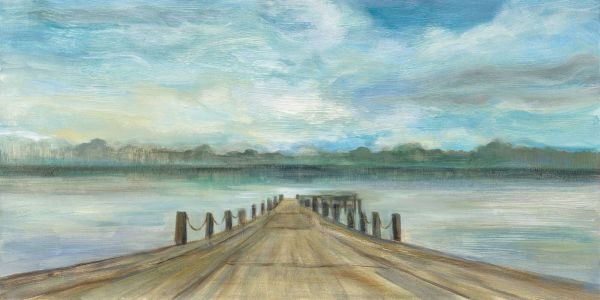 Ein hölzerner Steg erstreckt sich in einen ruhigen See, umgeben von sanften Wolken und grünen Ufern. Die malerischen Pinselstriche und kühlen Farbtöne vereinen Ruhe und Weite.