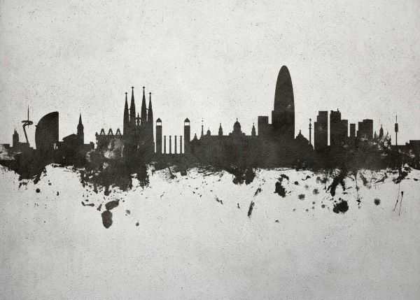 Eine Aquarell-Skyline von Barcelona im urbanen Stil. Die Skyline ist mit verschiedenen Hintergründen erhältlich.