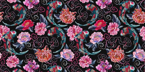 Asiatische Blumen und Käfigkarpfen auf Fototapete. Kombinieren Sie diese fröhliche Fototapete in Ihrem Wohn- oder Schlafzimmer für noch mehr Atmosphäre.