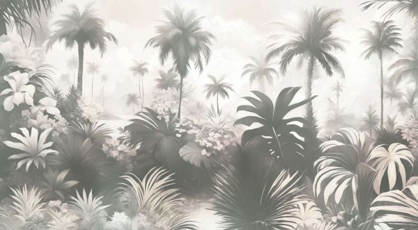 Diese tropische Landschaft in warmen Erdtönen strahlt eine raffinierte und beruhigende Atmosphäre aus. Die eleganten Palmen und üppigen tropischen Pflanzen sind in einen sanften Nebel gehüllt, wodurch eine traumhafte und nostalgische Stimmung entsteht. Die Farben variieren von subtilen Brauntönen und warmen Cremetönen bis hin zu sanften Grüntönen, was ein zeitloses und elegantes Gesamtbild schafft. Dank der neutralen und erdigen Töne fügt sich dieses Design perfekt in ein klassisches oder bohemisches Interieur ein. In einer klassischen Einrichtung kann es mit dunklen Hölzern, Ledermöbeln und Vintage-Accessoires kombiniert werden, um eine schicke und luxuriöse Ausstrahlung zu erzeugen. Für eine bohemische Atmosphäre harmoniert es gut mit Rattan, Leinen und natürlichen Stoffen, wodurch eine warme und einladende Ausstrahlung entsteht. Dieses Design passt auch wunderbar zu einem rustikalen oder botanischen Stil. In einem rustikalen Interieur kann es harmonisch mit robusten Holzmöbeln, handgefertigten Dekorationen und sanften Erdtönen kombiniert werden. Für einen botanischen Effekt kann es mit Zimmerpflanzen und leichten natürlichen Materialien ergänzt werden, wodurch das Dschungelgefühl noch stärker zur Geltung kommt. Dieses Design ist perfekt für Wohnzimmer, Schlafzimmer und Entspannungsräume, wo es eine beruhigende und stilvolle Atmosphäre schafft. Die Kombination aus exotischem Reichtum und Vintage-Farbtönen macht dieses Design zu einer einzigartigen und vielseitigen Wahl für Liebhaber einer warmen, stimmungsvollen und eleganten Einrichtung.