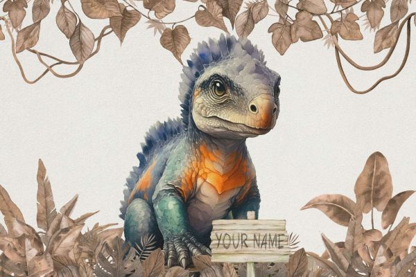 Ein Baby-Ankylosaurus in einem taupefarbenen Dschungel. Auch mit dem Namen Ihres Kindes erhältlich!