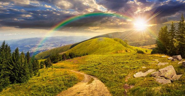 Berge bei einem schönen Sonnenuntergang mit einem Regenbogen. Mit dieser Fototapete in Ihrem Zuhause ist es, als könnten Sie direkt in diese Landschaft gehen.