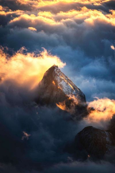 Ein mächtiger Berggipfel ragt steil aus einer tiefen Decke dichter Wolken empor, durch die grelles orangefarbenes Sonnenlicht wie Flammen bricht. Auf dem Gipfel thront ein kleines, sichtbares Kreuz, wodurch dieses Bild nicht nur visuell beeindruckend ist, sondern auch ein Gefühl von Stille, Hingabe und Erhabenheit hervorruft. Die Kombination aus kühlen Schatten in Blau und Grau mit warmen Lichtakzenten sorgt für ein dramatisches Zusammenspiel von Ruhe und Intensität. Die Struktur des Felsens, leicht mit Schnee bedeckt, betont die raue Schönheit der Natur. Der Glanz der Sonne scheint wie eine Krone auf dem Berggipfel zu liegen, was dem Ganzen eine fast spirituelle Ausstrahlung verleiht. Die dichte Wolkenmasse ringsum suggeriert Höhe, Einsamkeit und Freiheit und schafft eine intime Atmosphäre trotz der Größe der Landschaft. Dieses Design passt perfekt in ein modernes, minimalistisches oder sogar spirituell inspiriertes Interieur. In Räumen mit neutralen Wänden, natürlichen Materialien und ruhigen Texturen wird dieses Bild als visueller Ankerpunkt hervorstechen. Denken Sie an Kombinationen mit Betonoptik, Holzakzenten, wollweißem Leinen oder kupferfarbenen Accessoires. Besonders geeignet für Räume, in denen Sie Tiefe, Besinnung und emotionale Tiefe hinzufügen möchten - wie eine Leseecke, ein Schlafzimmer oder ein Homeoffice. Auch in einem Meditations- oder Stilleraum kommt dieses Bild besonders gut zur Geltung. Durch seine vertikale Komposition eignet es sich auch ideal für schmale Wände oder Nischen.