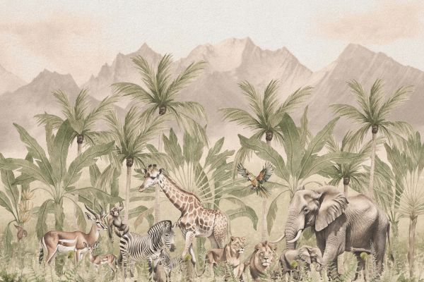 Dieses atemberaubende Design nimmt Sie mit auf eine Reise durch eine üppige Berglandschaft, in der eine farbenfrohe Flora und Fauna in Harmonie miteinander leben. Bewundern Sie exotische Safaritiere wie stattliche Giraffen, elegante Löwen und neugierige Elefanten, die sich frei in ihrem natürlichen Lebensraum bewegen. Lassen Sie sich von der natürlichen Pracht einer Safari inspirieren, direkt in Ihrem eigenen Lebensraum.