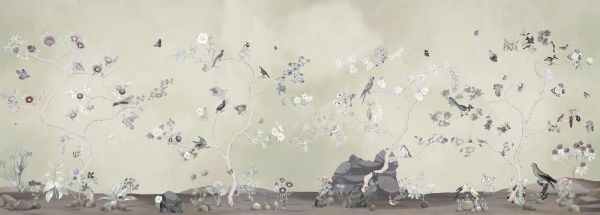 Dieses Design erweckt eine bezaubernde Atmosphäre zum Leben, in der Flora und Fauna meisterhaft zusammengeführt werden. Dezente Farben und feine Details bilden eine harmonische Landschaft, die die Ruhe der Natur ausstrahlt. Blühende Blumen, elegant fliegende Vögel und hübsche Schmetterlinge schaffen eine lebendige Szene, die sowohl Dynamik als auch Ruhe ausstrahlt. Die sanften Pastelltöne und organischen Formen passen perfekt in verschiedene Einrichtungsstile, von einem modernen skandinavischen Ambiente bis hin zu einer klassischen oder romantischen Atmosphäre.