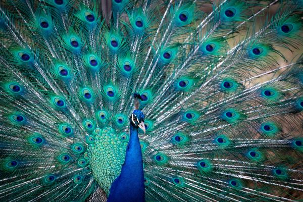 Hintergrundbild eines blauen Pfaus mit gespreiztem Federschwanz. Die Farben bringen mehr Atmosphäre in Ihr Zuhause.