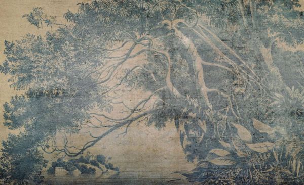 Ein träumerisches tropisches Panorama entfaltet sich in sanften, verwaschenen Blautönen auf einem warmen, beigen Untergrund mit der Ausstrahlung von verwittertem Leinen. Große Bäume mit anmutigen, geschwungenen Ästen füllen das Bild, während im Hintergrund eine kolonial anmutende Landschaft mit Wasser, Palmen und Villen ein Gefühl von Zeitlosigkeit hervorruft. Der Stil erinnert an klassische Toile- oder Ätztechniken und strahlt eine stille Eleganz aus. In einem klassischen oder ländlichen Interieur sorgt dieses Design für einen beruhigenden und raffinierten Akzent, zum Beispiel in Kombination mit antikem Holz, Leinenvorhängen, Messingdetails und ruhigen Farben wie Sand, gebrochenem Weiß oder Graugrün. In einem eher bohemien oder botanischen Interieur bildet dieses Design eine überraschende Basis für natürliche Materialien, Rattan, handgefertigte Accessoires und viele Pflanzen. Die zurückhaltenden Farben ermöglichen es, das Bild großflächig anzuwenden, ohne dass es zu dominant wirkt. Besonders geeignet für Schlafzimmer, Eingangsbereiche, Wintergärten oder sogar ein klassisches Badezimmer, wo man ein Gefühl von Ruhe und Natur hervorrufen möchte. Auch in einem Boutique-Hotel, einer Buchhandlung oder Galerie kommt dieses poetische Szenario wunderbar zur Geltung. Die Verwendung von verwaschenen Blautönen und sanften Erdtönen, kombiniert mit der feinen Zeichnung von Blättern, Stämmen und Hintergrundstrukturen, sorgt für eine stille Erhabenheit. Die subtilen Texturen verleihen dem Ganzen einen verwitterten Charme, der sowohl warm als auch raffiniert wirkt — als ob man eine Wand in einem alten, tropischen Herrenhaus betrachtet.