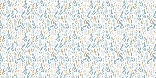 Blaue Tapete mit einem Muster aus verschiedenen Blättern. Diese Blätter befinden sich auf einem weißen Hintergrund.