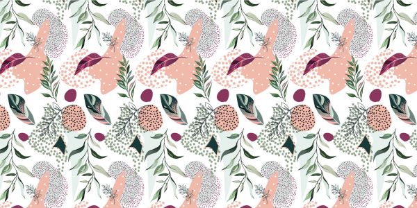 Rosa Fototapete mit weißem Hintergrund und verschiedenen Arten von Zweigen.
