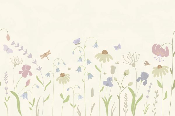 Tapete - Blumenfeld hoch mit Schmetterlingen beige, altrosa, grün und flieder