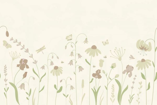 Tapete - Blumenfeld hoch mit Schmetterlingen beige und altrosa