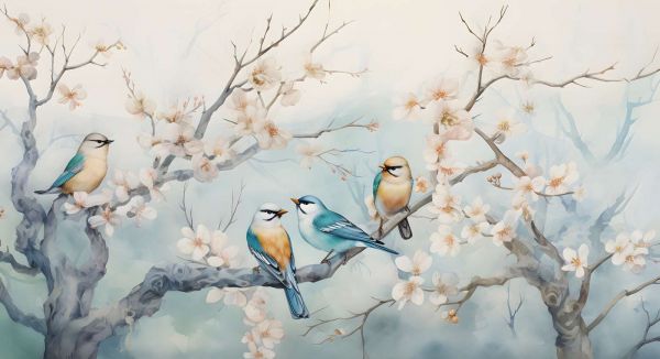 Sanfte Vögel sitzen anmutig zwischen den Zweigen blühender Blüten. Die subtile Farbpalette und die ruhige Komposition rufen das friedliche Gefühl eines Frühlingsmorgens hervor, an dem die Natur in einer harmonischen Melodie aus Farben und Formen erwacht.