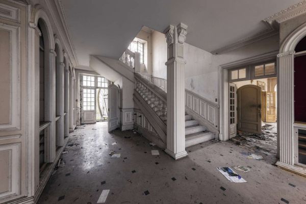 Die Lobby eines verlassenen Hotels in einer Ferienanlage im Osten Frankreichs. Dieses Hotel hat wohl nie einen einzigen Gast gesehen. Dem Projekt ging noch vor Eröffnung das Geld aus und es wurde nie in Betrieb genommen.