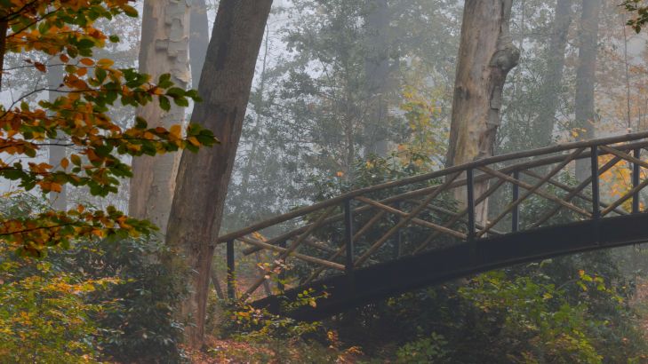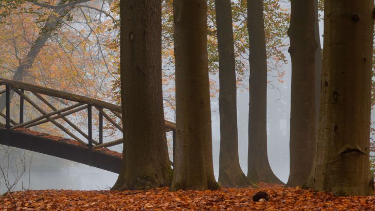 Brücke im Herbstwald auf Fototapete. Diese Tapete bringt die schönen Farben des Herbstes in Ihr Zuhause.