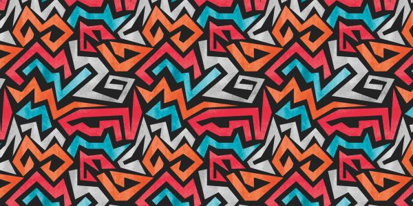 Tapete mit grafischen Zick-Zack-Linien in Rot, Orange, Blau und Rot auf schwarzem Hintergrund.
