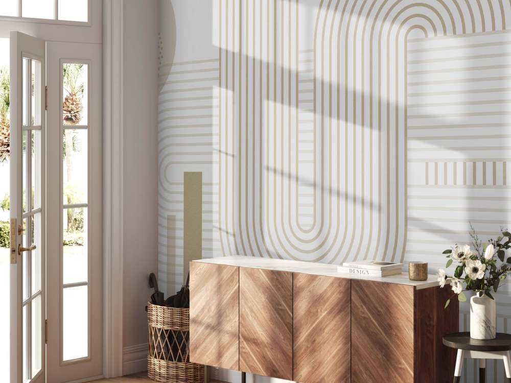 Mit einer raffinierten Verschmelzung von Kurven und Linien bringt dieses Design eine klassische Eleganz in den Vordergrund. Die sanfte Farbpalette aus Beige und Creme verleiht ihm zeitlose Schönheit, während die gepunkteten Akzente einen modernen Touch verleihen.