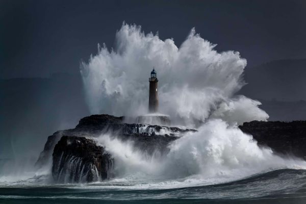 Kamm auf Fototapete. Ein spektakuläres Bild von Wasser, das hoch über einen Leuchtturm steigt.