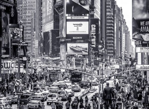 Das pulsierende Herz der Stadt wird in diesem Bild vom Times Square lebendig, wo die ständige Bewegung und die urbane Energie in einem monochromen Farbton eingefangen sind. Das geschäftige Treiben der Stadt wird durch den Strom von Autos und Menschen unterstrichen, ein Symbol für die niemals schlafende Stadt.