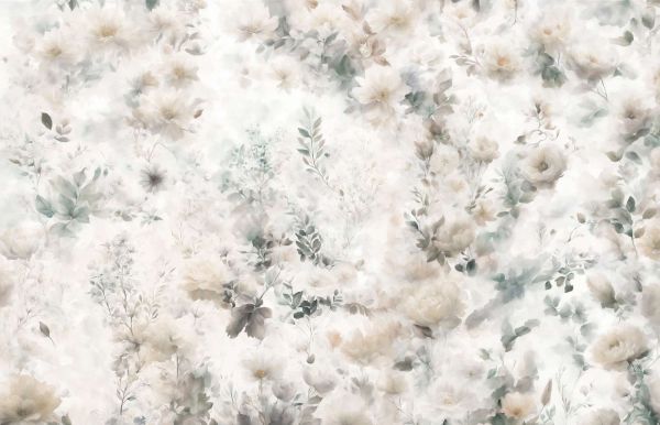 Eine romantische Komposition aus sanften Blumen in Pastellfarben wie Rosa, Creme und Grün. Die zarten Pinselstriche schaffen eine ruhige und verträumte Atmosphäre, perfekt, um ein Gefühl von Ruhe und Eleganz hervorzurufen.