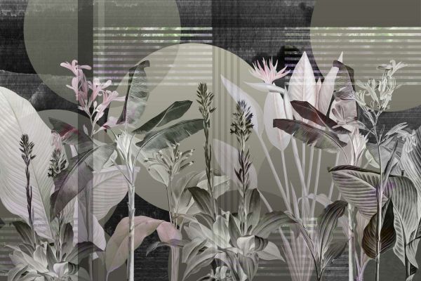 Dieses Design schafft eine raffinierte Balance zwischen der wilden Schönheit tropischer Pflanzen und der Schlichtheit geometrischer Muster. Die detaillierten Illustrationen von Blättern mit ihren sanften Grau-, Grün- und Violetttönen werden subtil durch abstrakte Kreise und Linien unterstützt und erzeugen so eine vielschichtige Tiefe. Dieser Mix aus Natur und Moderne macht dieses Design einzigartig und vielseitig.