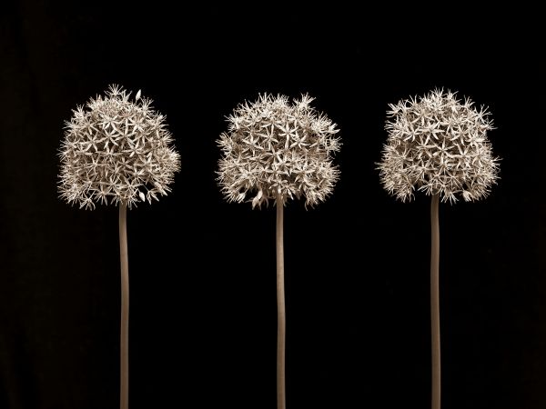 Drei Allium-Blüten in einer Reihe. Durch den schwarzen Hintergrund kommen die Blumen besonders gut zur Geltung.