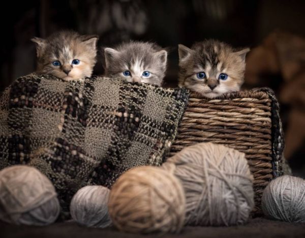 Drei Katzen in einem Korb in verschiedenen Materialien