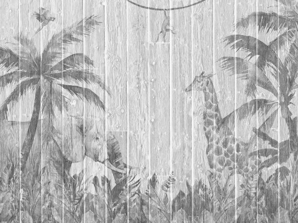 Fröhliche Dschungeltiere mit verschiedenen Pflanzen auf Holz im Vordergrund. Die Holzoptik dieser Tapete macht sie geeignet für einen anspruchsvollen Raum.