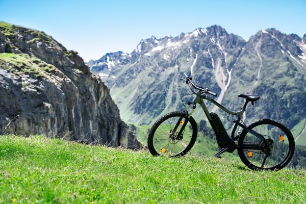 Fototapete von einem E-Bike in den Bergen in Österreich. Bringen Sie diese an der Wand in Ihrem Schlafzimmer an.
