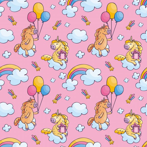 Fototapete mit Einhörnern, Luftballons und Regenbögen. Bringen Sie diese an der Wand im Kinderzimmer an.