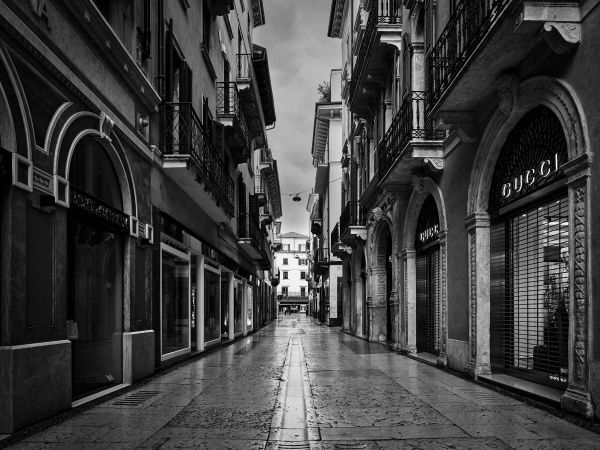 Einkaufsstraße in Schwarz und Weiß in verschiedenen Materialien
