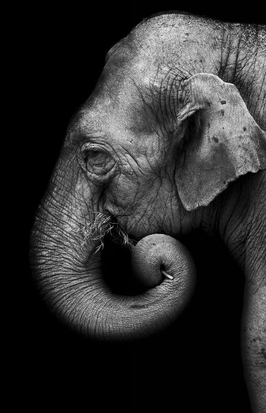 Schwarz-Weiß-Porträt eines großen Elefanten.