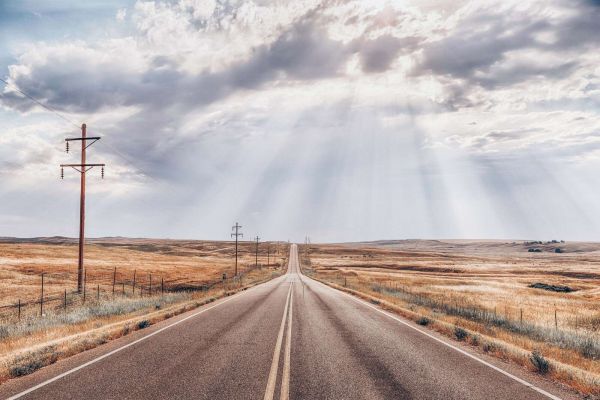 Ein langer, gerader Weg führt durch eine weite, goldgelbe Landschaft. Sanfte Sonnenstrahlen dringen durch eine bewölkte Luft und erzeugen ein dramatisches, aber hoffnungsvolles Lichtspiel über dem offenen Feld.
