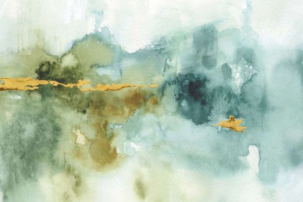 Eine träumerische Aquarellkomposition in Grüntönen und Blautönen, durchzogen von einer eleganten, goldfarbenen Linie. Das Design strahlt Ruhe aus und hat eine organische, natürliche Bewegung.