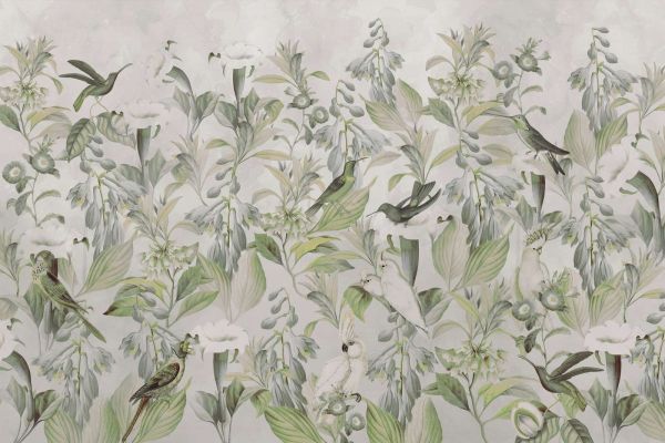 Lassen Sie sich von einem atemberaubenden Design mitreißen, in dem die Eleganz tropischer Vögel mit der zarten Schönheit blühender Blumen verwoben ist. Diese üppige und detaillierte Komposition zeigt eine Harmonie lebendiger Farbtöne und sanfter Pastellfarben, die zusammen ein Gefühl von Ruhe und Raffinesse ausstrahlen. Dieses Design passt perfekt zu verschiedenen Einrichtungsstilen, wie modern und bohemien. Die ausgewogene Kombination aus detaillierten Mustern und zurückhaltenden Farben macht es ideal, um eine entspannte, aber luxuriöse Atmosphäre in jedem Raum zu schaffen.