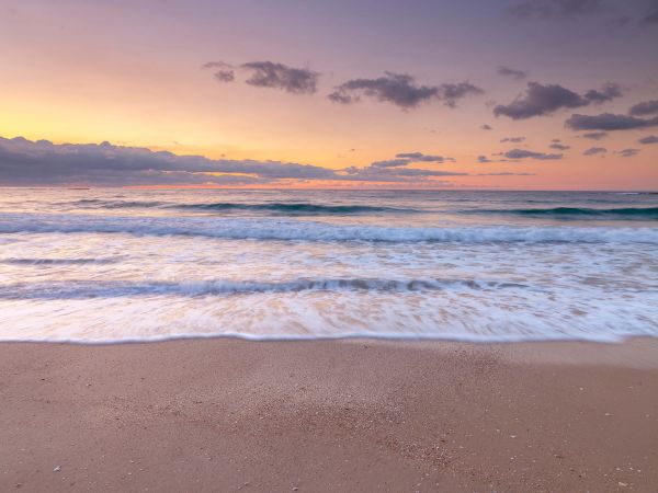 Ein farbenprächtiger Sonnenuntergang an einem ruhigen Strand.