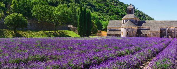 Ein märchenhaftes Bild von einem Lavendelfeld mit einem kleinen Schloss im Hintergrund.
