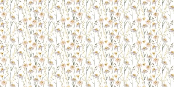Dieses Design fängt die Essenz einer sommerlichen Blumenwiese ein, mit anmutigen Gänseblümchen und subtilen botanischen Akzenten in Tönen von weichem Rosa und warmem Gold. Die wiederkehrende Flora schafft einen beruhigenden Rhythmus, der eine Atmosphäre der Entspannung und natürlichen Schönheit erzeugt.
