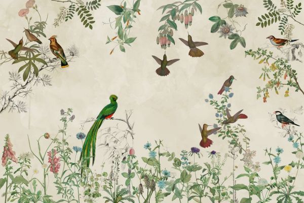 Ein lebendiges und elegantes Design mit exotischen Vögeln, zarten Blumen und geschwungenen Zweigen. Die Mischung aus detaillierten Illustrationen und subtilen Farben schafft eine harmonische und natürliche Atmosphäre.