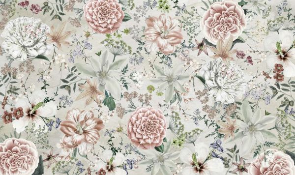 Dieses Design vereint die Schönheit klassischer Blumen mit einem raffinierten, weichen Look. Große, elegante Blüten wie Pfingstrosen und Rosen wechseln sich mit kleineren Blüten und Blättern ab, platziert vor einem neutralen Hintergrund, der Ruhe und Ausgeglichenheit ausstrahlt. Die Farben sind dezent und harmonisch, mit Nuancen von Creme, zartem Rosa, Beige und Grün.