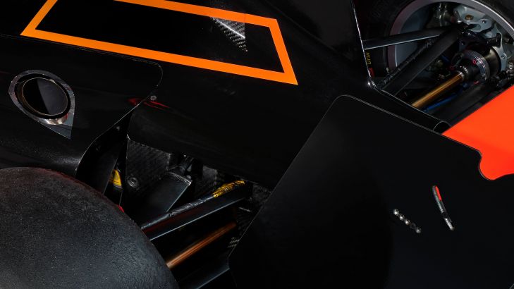 Detaillierte schwarze Fototapete eines Formel-3-Rennwagens, bei der sowohl die Seite als auch das Heck deutlich sichtbar sind. Beispiellose Details wie die Lüftungsgitter und der Heckspoiler aus Carbon.