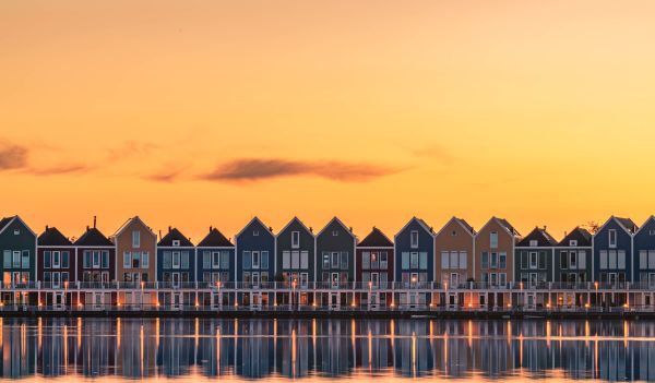 Zerbrechlich wie eine Feder auf einer Fototapete. Eine Reihe von Häusern am Wasser mit einem orangefarbenen Himmel im Hintergrund.