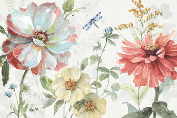 Großes Aquarellmotiv von sommerlichen Blumen in Rot, Gelb und Blaugrün, umrahmt von zartgrünem Laubwerk und einer anmutigen Libelle. Ein harmonisches und malerisches Szenario voller Ruhe und Farbe.