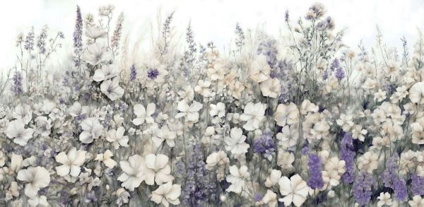 Dieses Design fängt die Magie einer sanften Blumenwiese in einem traumhaften und ruhigen Stil ein. Die zarten weißen und lilafarbenen Blumen, die von filigranen Blüten bis hin zu üppigen Blütenständen reichen, bilden eine harmonische Szenerie, die ein Gefühl von Ruhe und Raffinesse hervorruft. Die subtilen Aquarelltöne sorgen für eine sanfte und elegante Ausstrahlung, wodurch das Design mühelos in verschiedene Einrichtungsstile passt.