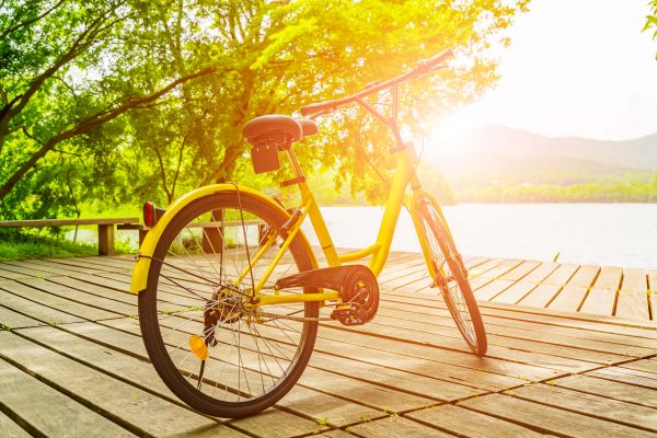 Ein gelbes Fahrrad auf einem Holzsteg am Wasser. Kombinieren Sie diese Tapete zum Beispiel im Schlafzimmer.