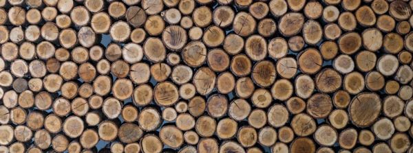 Gestapelte Holzblöcke, einer Wand voller Baumstämme.