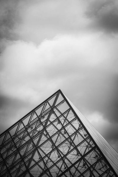 Eine scharfe Glaspyramide ragt vor dramatischem Wolkenhimmel hervor. Das Spiel von Linien und Reflexionen betont modernen Minimalismus und architektonische Stärke.